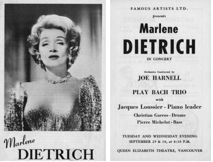 Piaf / Dietrich is playing at London’s Grand Theatre and it’s fabulous, The play centres around Piaf in 1963, less than a year before Dietrich propositioned me after her concert in Vancouver. She, turning 64 to my 20. She invited me to her hotel suite for a game of Euchre after the party. Since I didn’t know the game, she was going to teach me… how naive I was! But I had a dorm curfew of midnight as an exchange student at UBC and so didn’t dare. Just think... and of course, a poem ensued:
